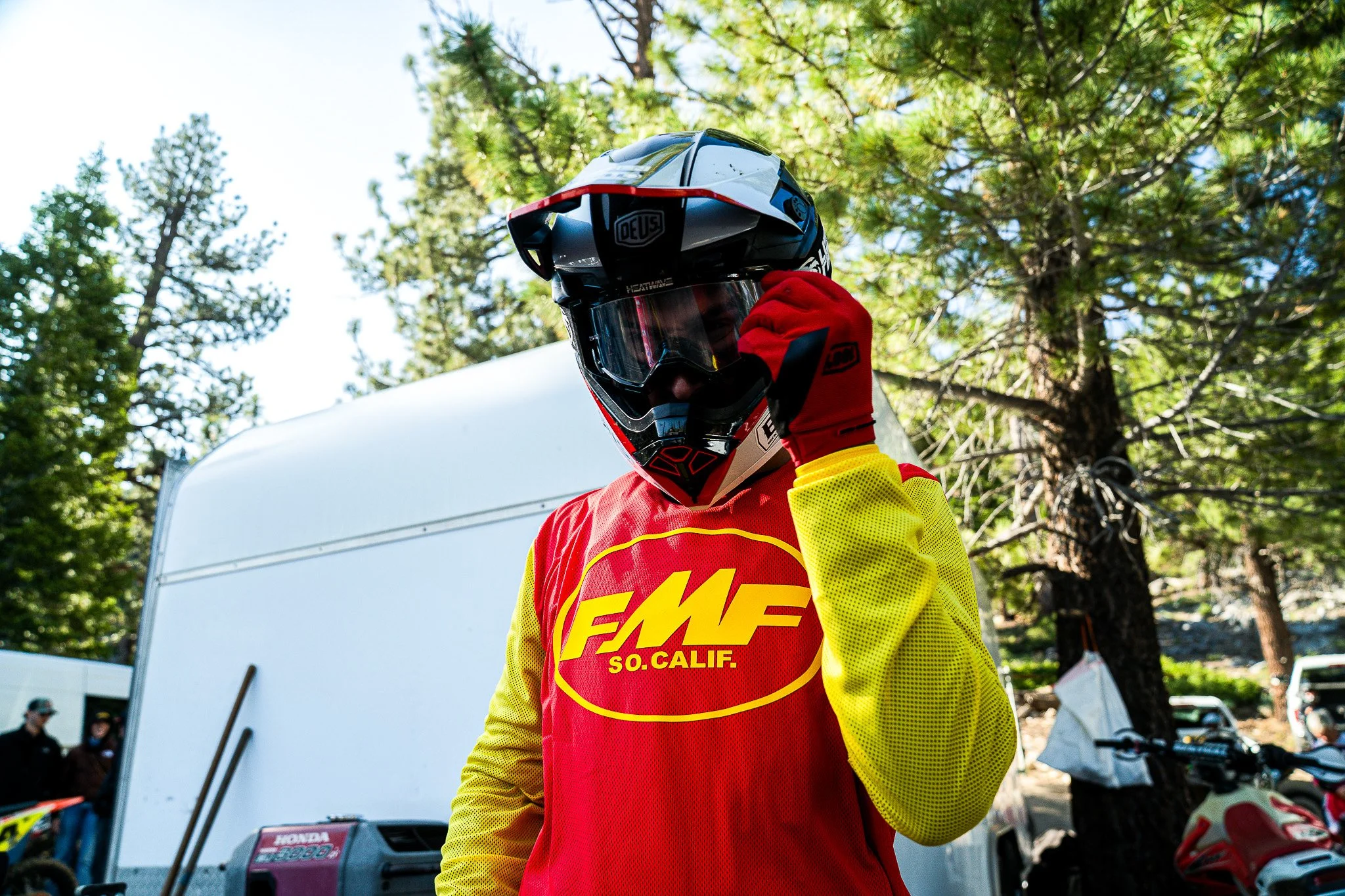 A motocross rider wearing a black and white helmet with a visor, goggles, red and yellow gear with 'FMF So. Calife' printed on the chest, standing outdoors among trees and other motocross bikes.